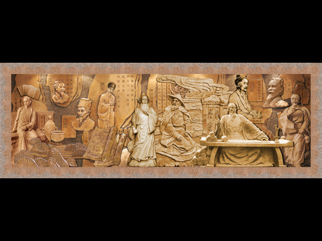 這個銅浮雕墻是為安徽金馬藥業(yè)設計的大門墻壁裝飾浮雕設計方案。以我國歷史上著名的醫(yī)者人物為主要雕刻對象,配以古文字、圖案、書卷等古代物品突出了醫(yī)藥的主題并彰顯了公司的歷史文化和傳統(tǒng)。
