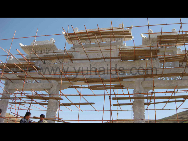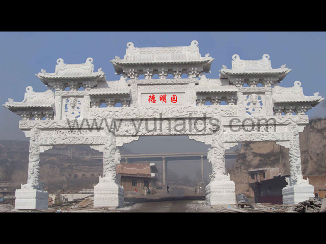 這是南京德明園大理石石雕牌坊應用案例。整個牌坊以大理石雕刻制作而成,主要以龍紋作為裝飾圖案,包括柱體和牌坊其他部件,大都可以看到龍的形態。
